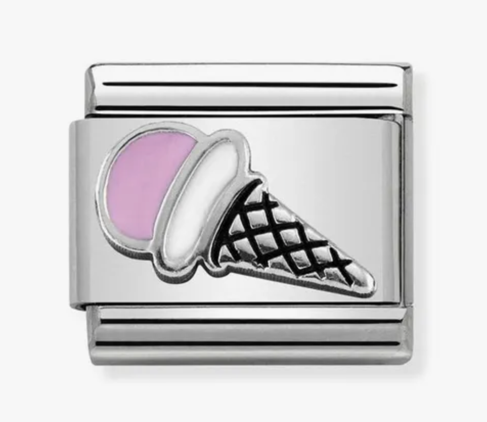 This elegant charm features a delicate silver base accented with smooth pink enamel, crafted in the shape of a charming ice cream cone. Its refined design adds a subtle yet playful touch to any bracelet or necklace, making it a sophisticated accessory perfect for expressing your sweet side with understated style.
