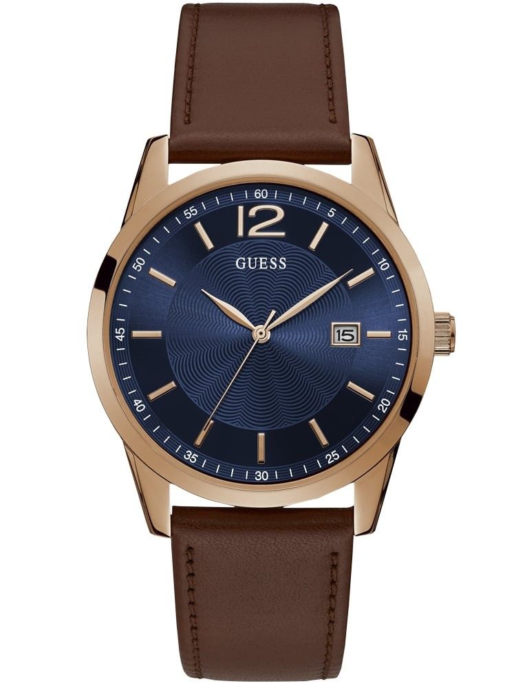 Guess Watch Mens Perry W1186G3 Rose Gold Case with Blue Trim Date Dial Brown Leather Strap