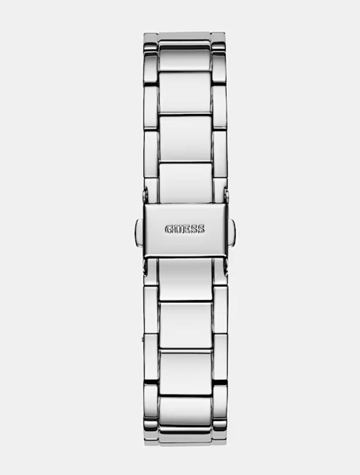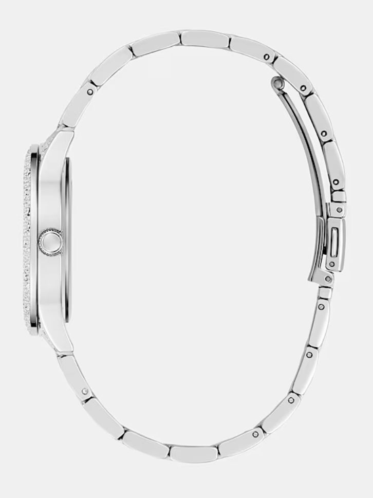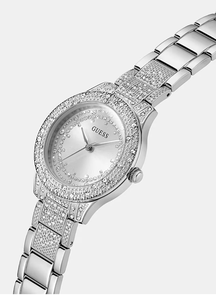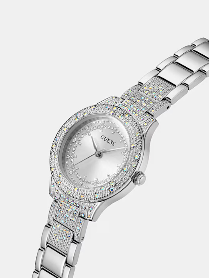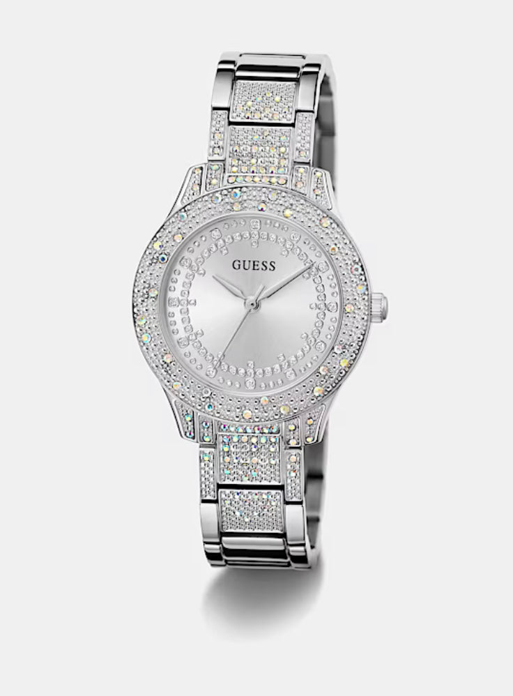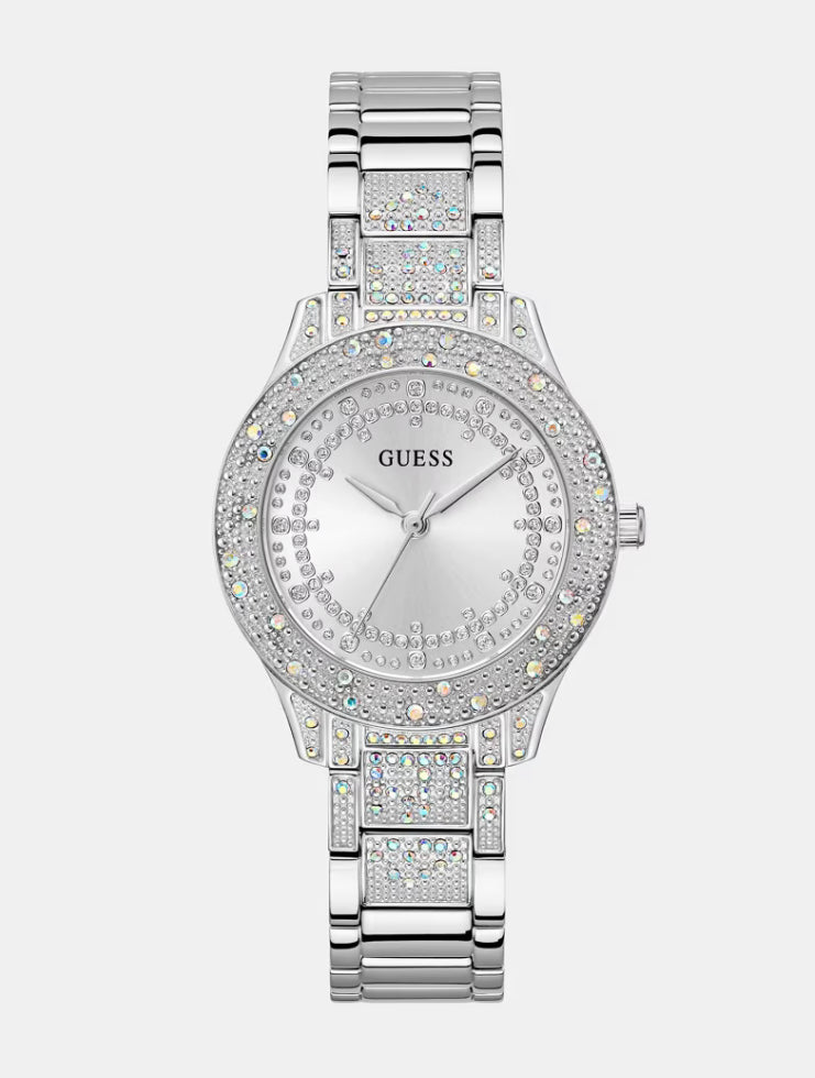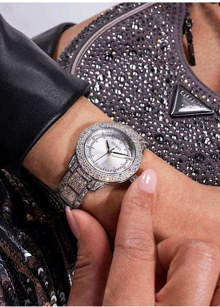 Make a statement with the Guess Women’s Crystal Appliqué Detailing Watch. Its luxurious crystal finish and diamond design offer a perfect blend of sparkle and sophistication.