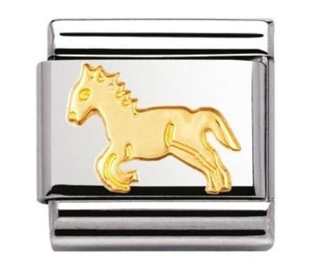 The Nomination Classic Gold Horse Charm Link embodies elegance and grace, crafted in lustrous gold to enhance your charm bracelet with a refined equestrian touch.