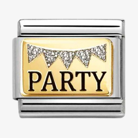 Get ready to party with the Nomination Classic Gold Party charm! This charming charm features glitter bunting on a gold link, adding a touch of fun and celebration to your Nomination bracelet. Perfect for any party animal or to commemorate a special occasion. Let's get the party started!