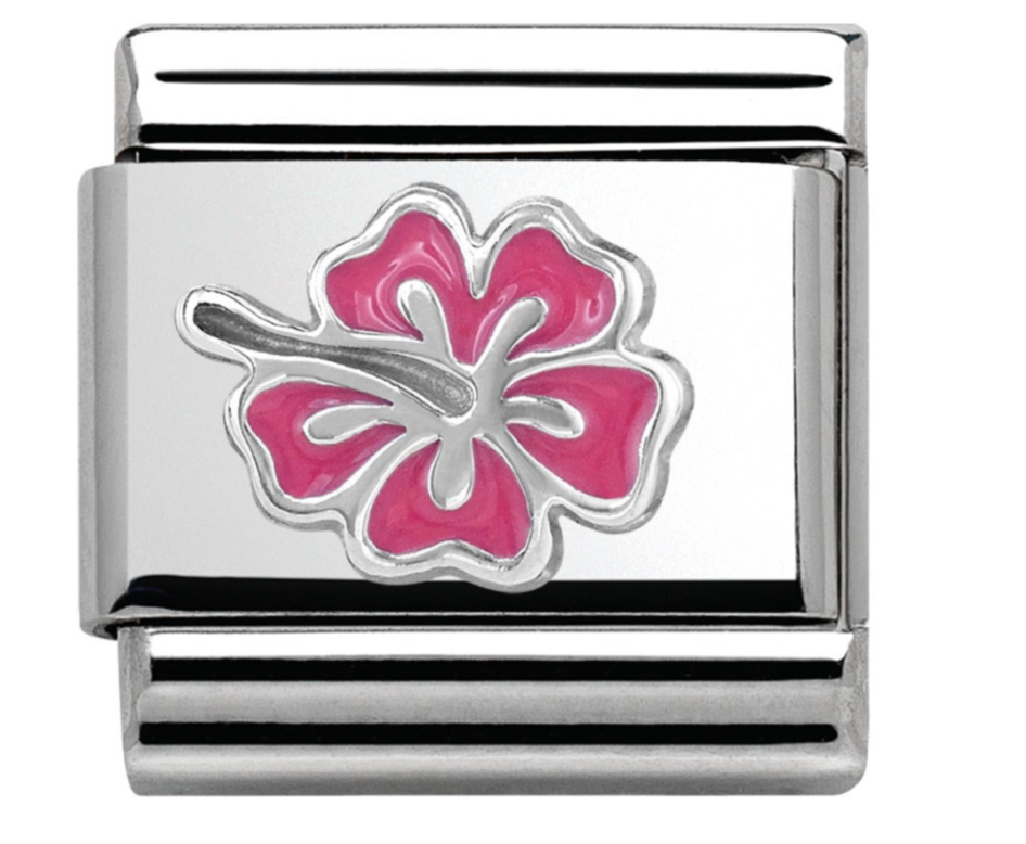 The Nomination Pink Hibiscus Charm Link captures delicate beauty with its elegant pink enamel hibiscus flower design. This refined charm adds a subtle splash of colour and grace to your collection.