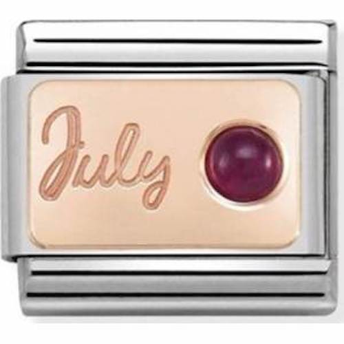 Celebrate your July birthday in style with our Nomination Rose Gold charm. featuring a stunning ruby birthstone. Made of high-quality rose gold, this charm adds a touch of elegance and meaning to any charm bracelet. A perfect gift for a loved one (or yourself!) who loves a bit of sparkle and charm.