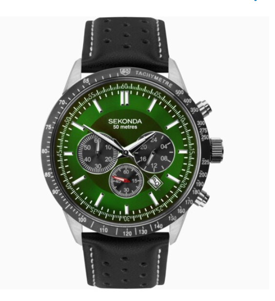 The Sekonda Chronograph Quartz men's watch combines precision with style, featuring a striking green dial and a sleek black leather strap. Its chronograph functionality offers practical timekeeping, while the sophisticated design ensures it stands out as a refined accessory for any occasion.