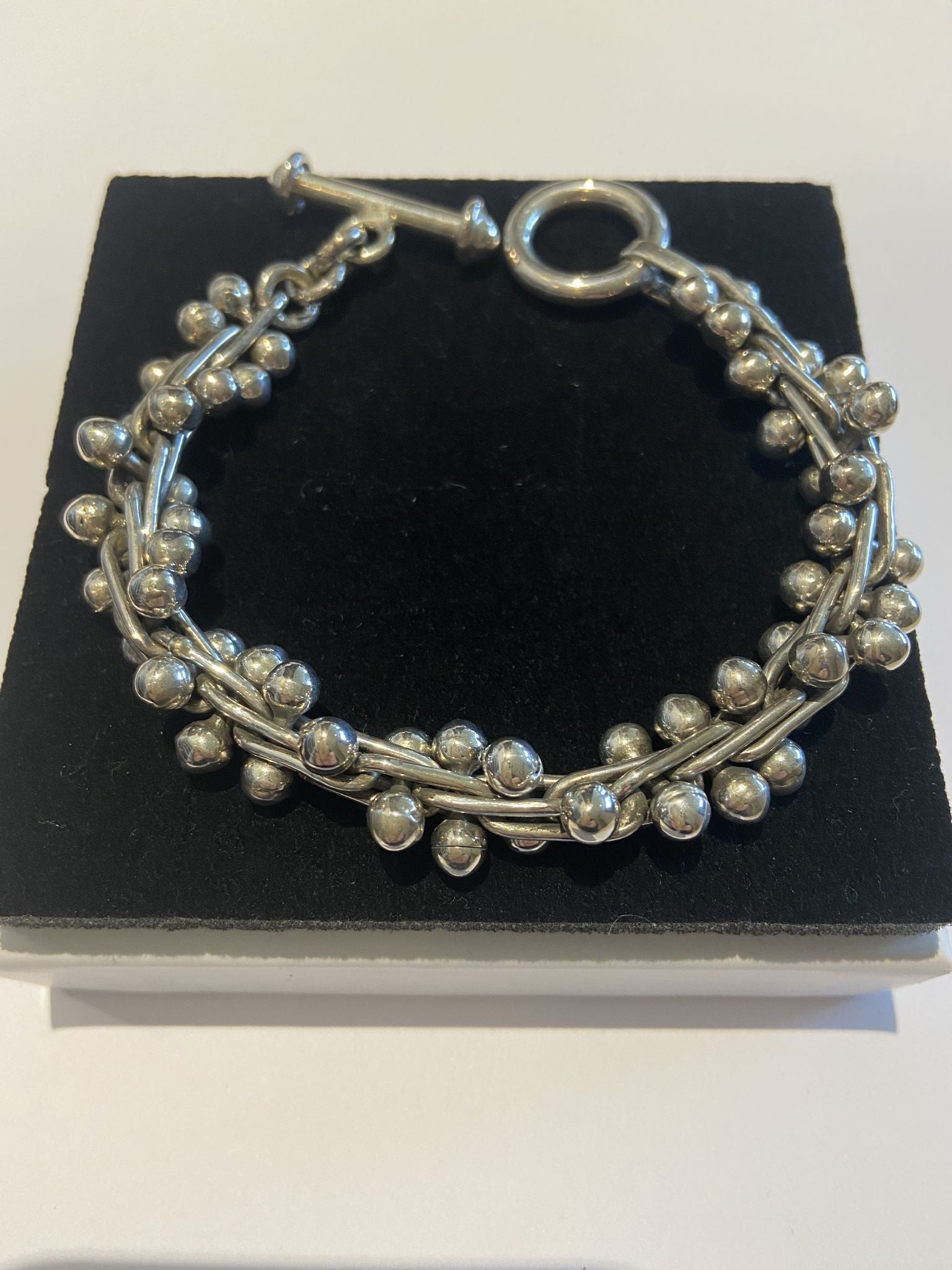 A Beautiful hand crafted extremely heavy sterling silver bracelet. A style that has been popular for a very long time.T bar toggle catchLength 18cms Perfect for most adults. All items are in stock and will be posted within 24hrs.