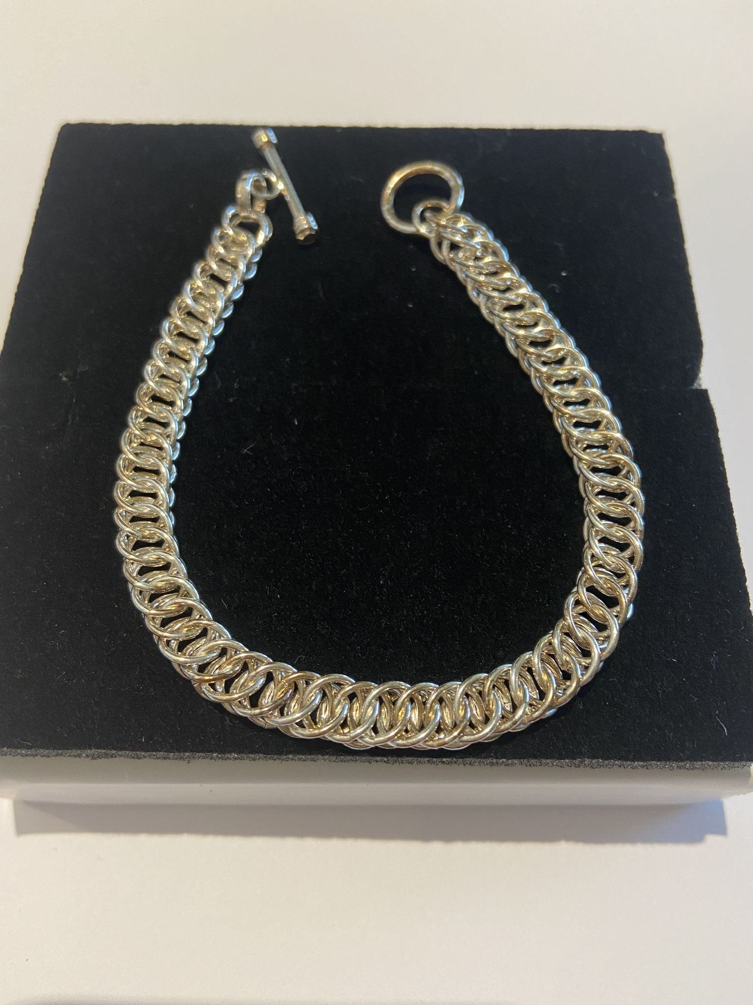 A Beautiful hand crafted sterling silver bracelet.T bar toggle catchLength 18cmsAll items are in stock and will be posted within 24hrs.