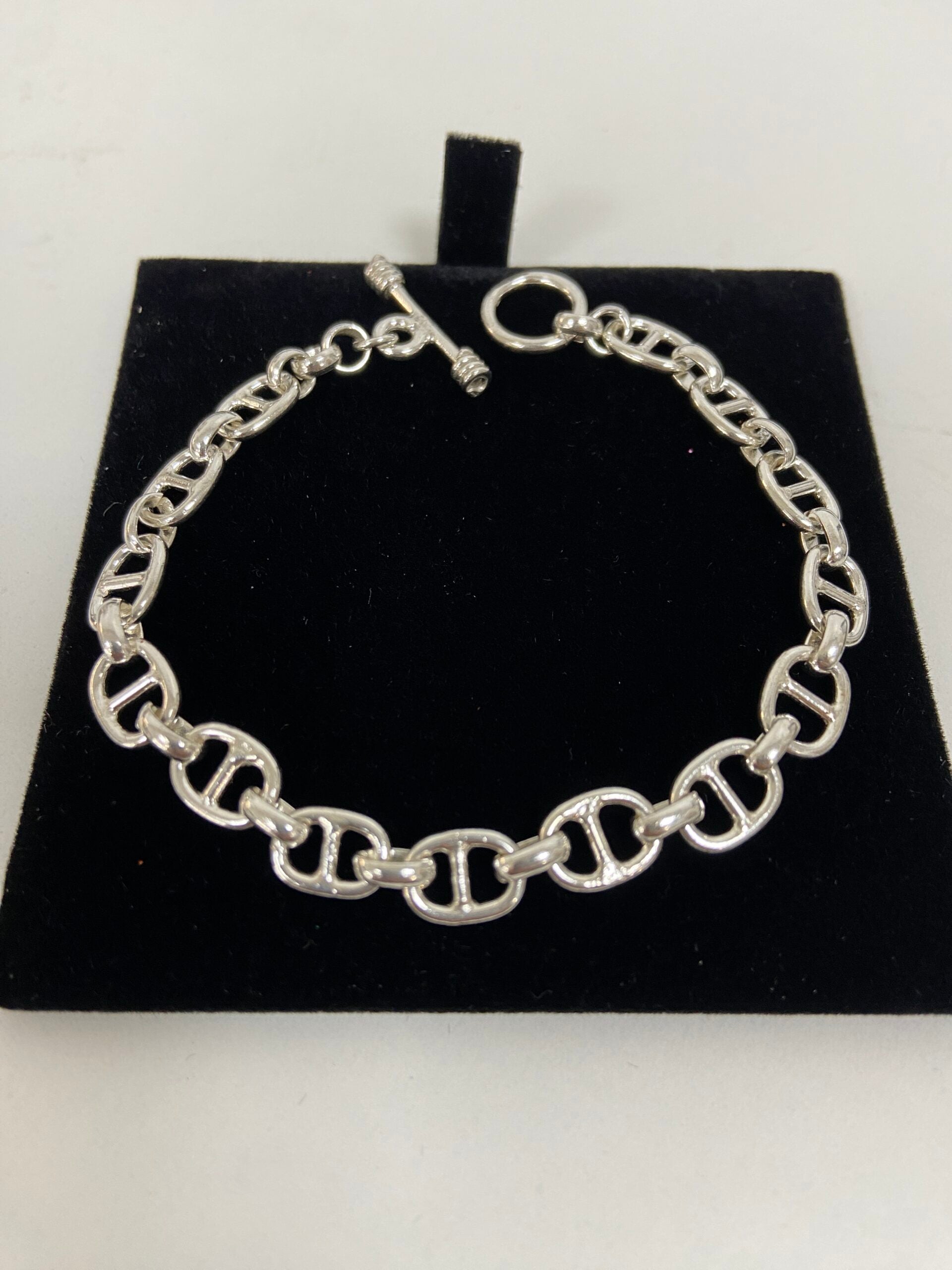 A Beautiful hand crafted sterling silver bracelet, linking figure of 8 like links. T bar toggle catch Length 18cms Perfect for most adults. All items are in stock and will be posted within 24hrs.