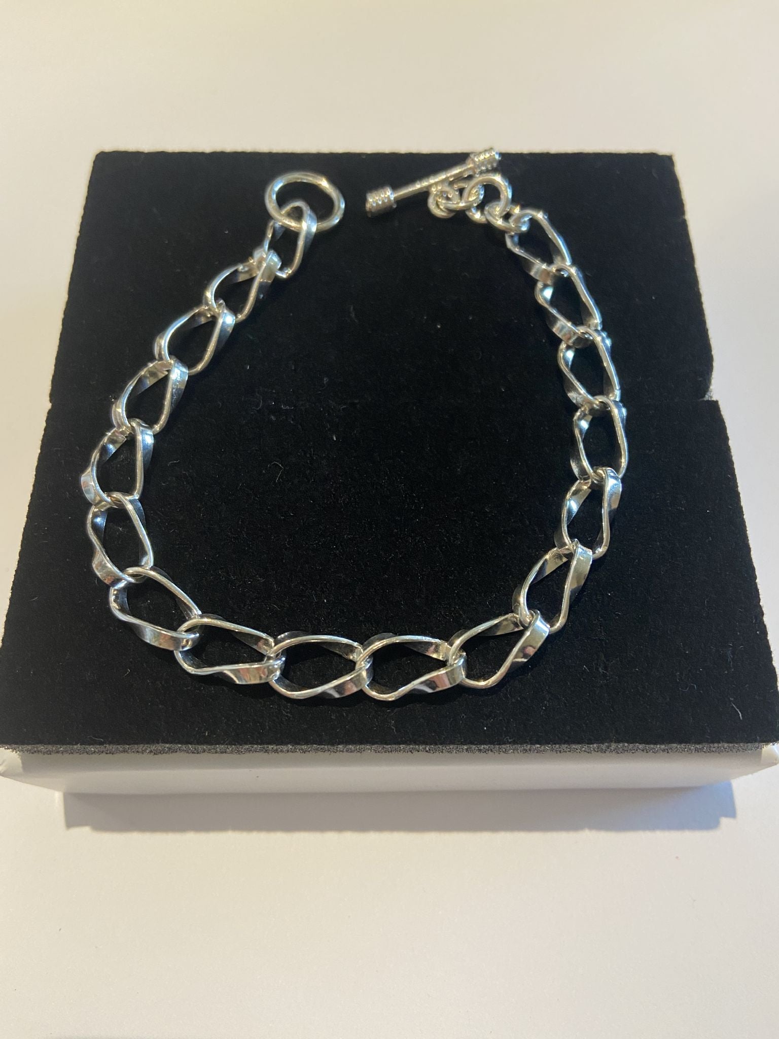 A Beautiful hand crafted sterling silver bracelet.T bar toggle catchLength 18cmsAll items are in stock and will be posted within 24hrs.
