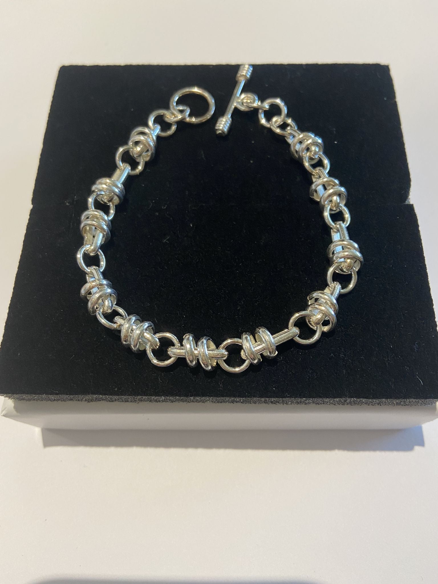 A Beautiful hand crafted sterling silver bracelet.T bar toggle catchLength 18cmsAll items are in stock and will be posted within 24hrs.