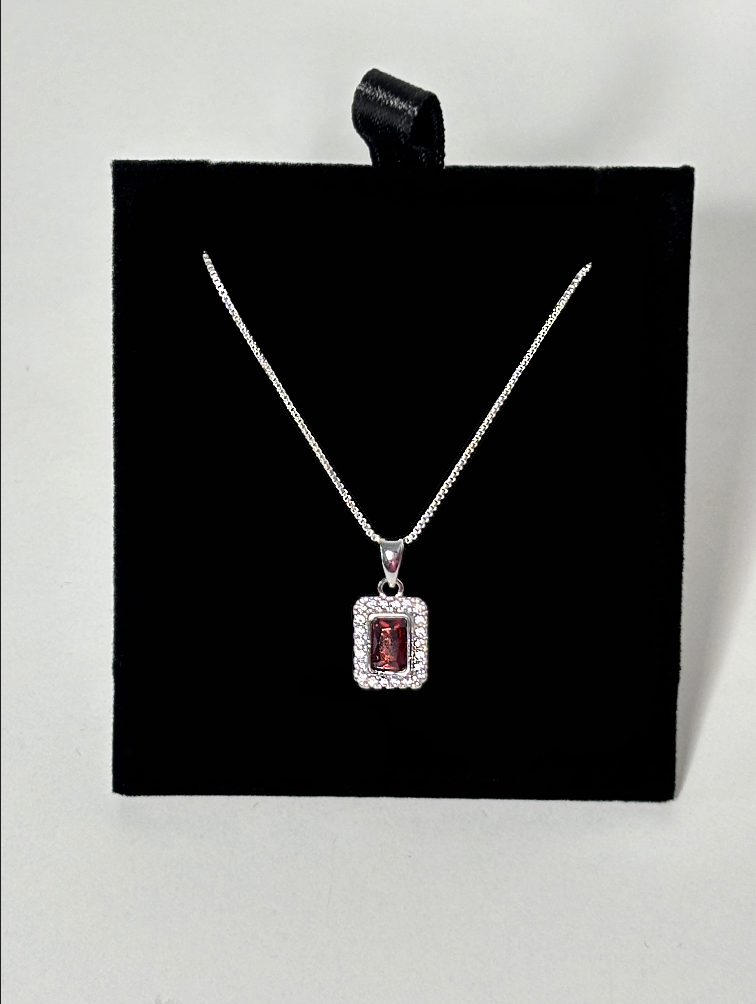 Silver Rectangular Red CZ Stone Necklace