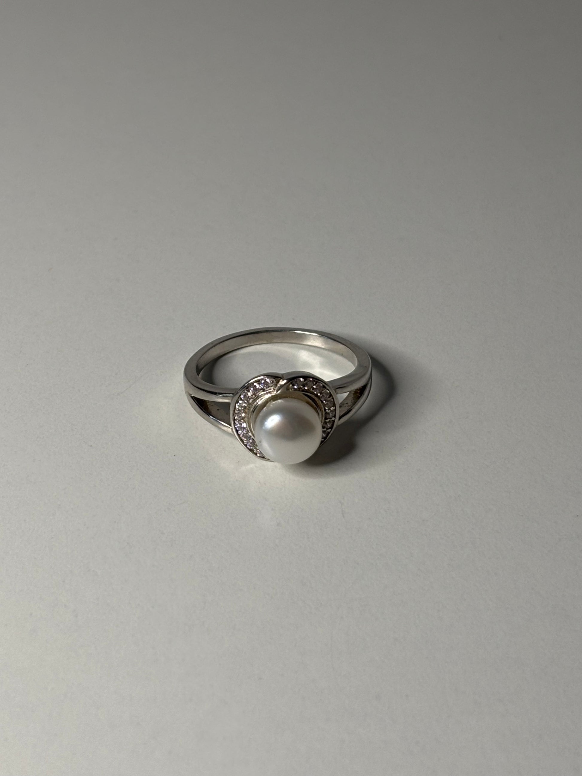 This sterling silver ring features a lustrous pearl centerpiece elegantly surrounded by sparkling cubic zirconia stones, creating a timeless and refined accessory. Its delicate design enhances any ensemble with a touch of sophistication and classic charm.