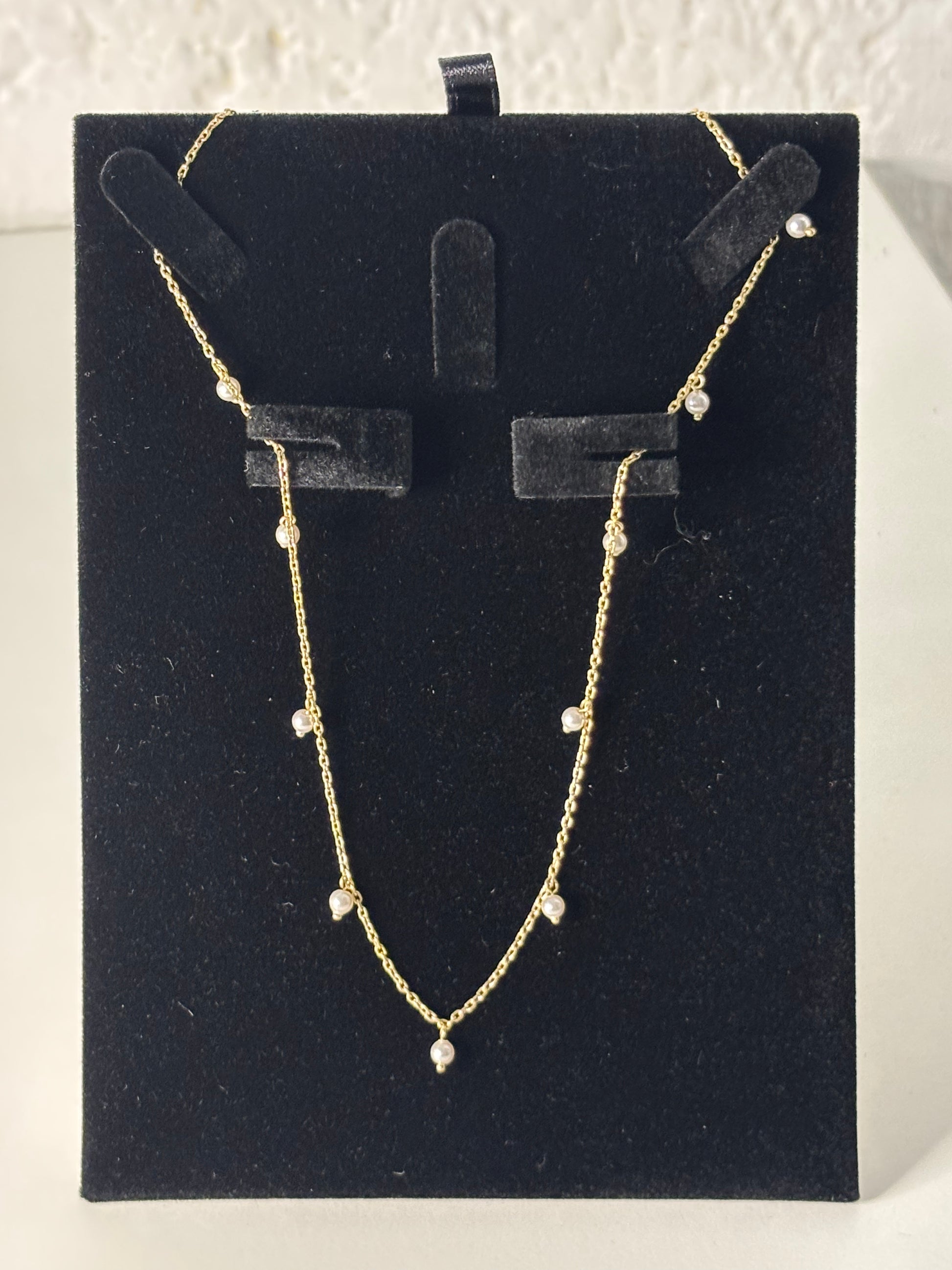 Elevate your elegance with this Thin Chain Gold Plated Necklace adorned with delicate pearls. Its refined design combines the warm glow of gold plating with the timeless beauty of pearls, creating a subtle yet striking accessory perfect for both everyday wear and special occasions. Lightweight and graceful, this necklace adds a touch of sophistication to any outfit.
